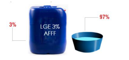 O LGE AFFF ARC 3% x 3% deve ser misturado com água doce ou do mar na proporção de 3% de LGE para 97% de água, para o combate a incêndio em hidrocarbonetos classe HC e solventes polares classe AR.